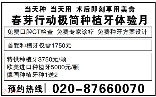 您是否長期遭受多顆牙缺失的困擾?您是否有在年前種牙的想法,卻有很多顧慮和疑問,或因為牙槽骨 萎縮、牙周炎等問題難以實現(xiàn)?春芽行動、春芽口腔種植研究所聯(lián)合德國口腔頜面外科協(xié)會,年前將集中為前牙缺失、后牙缺失、多顆牙缺失、半口無牙甚至全口無牙患者一對一制定德國領(lǐng)先的數(shù)字化種牙方案。市民預(yù)約種牙免口腔CT檢查費、專家會診費。極簡種植牙“迎春至簡價”體驗月,首顆種植牙1750元(含基臺、牙冠),更多優(yōu)惠種牙資訊可撥打熱線020-87660070垂詢。
