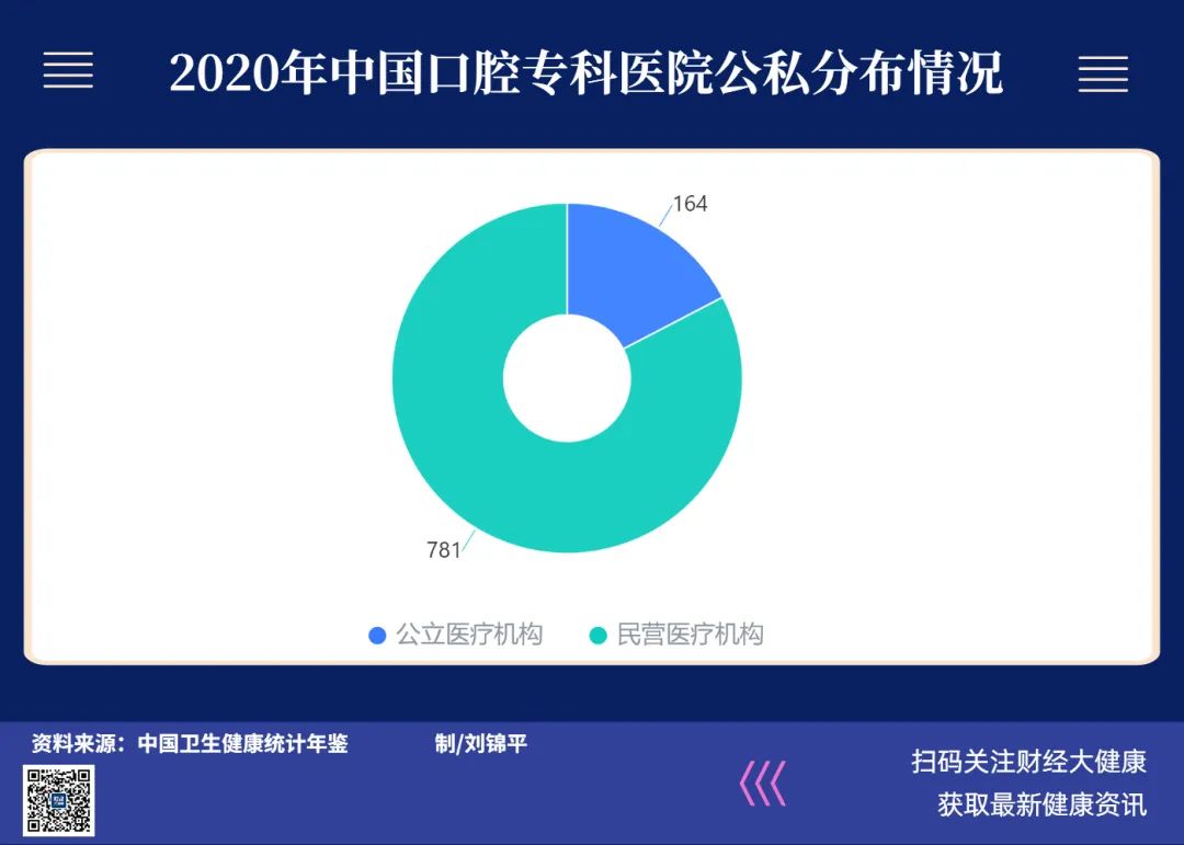 口腔服務(wù)市場化程度頗深。據(jù)2021年中國衛(wèi)生健康年鑒,2020年底,中國口腔??漆t(yī)院總數(shù)約為945家,其中公立口腔??漆t(yī)院數(shù)為164家,民營口腔??漆t(yī)院數(shù)為781家,民營在口腔醫(yī)院總數(shù)中占比達(dá)83%。