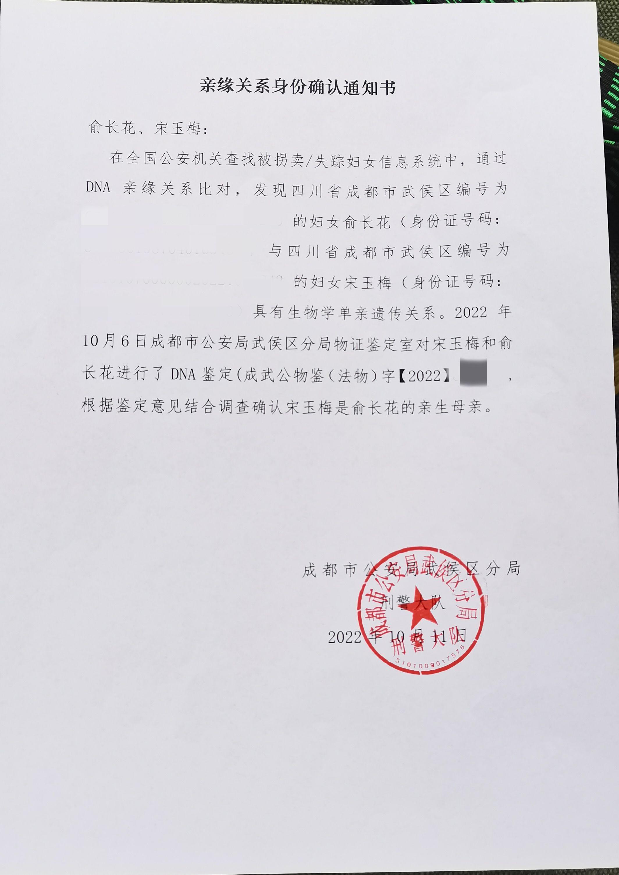 10月12日,俞長花在派出所領取了《親緣關系身份確認通知書》。受訪者供圖