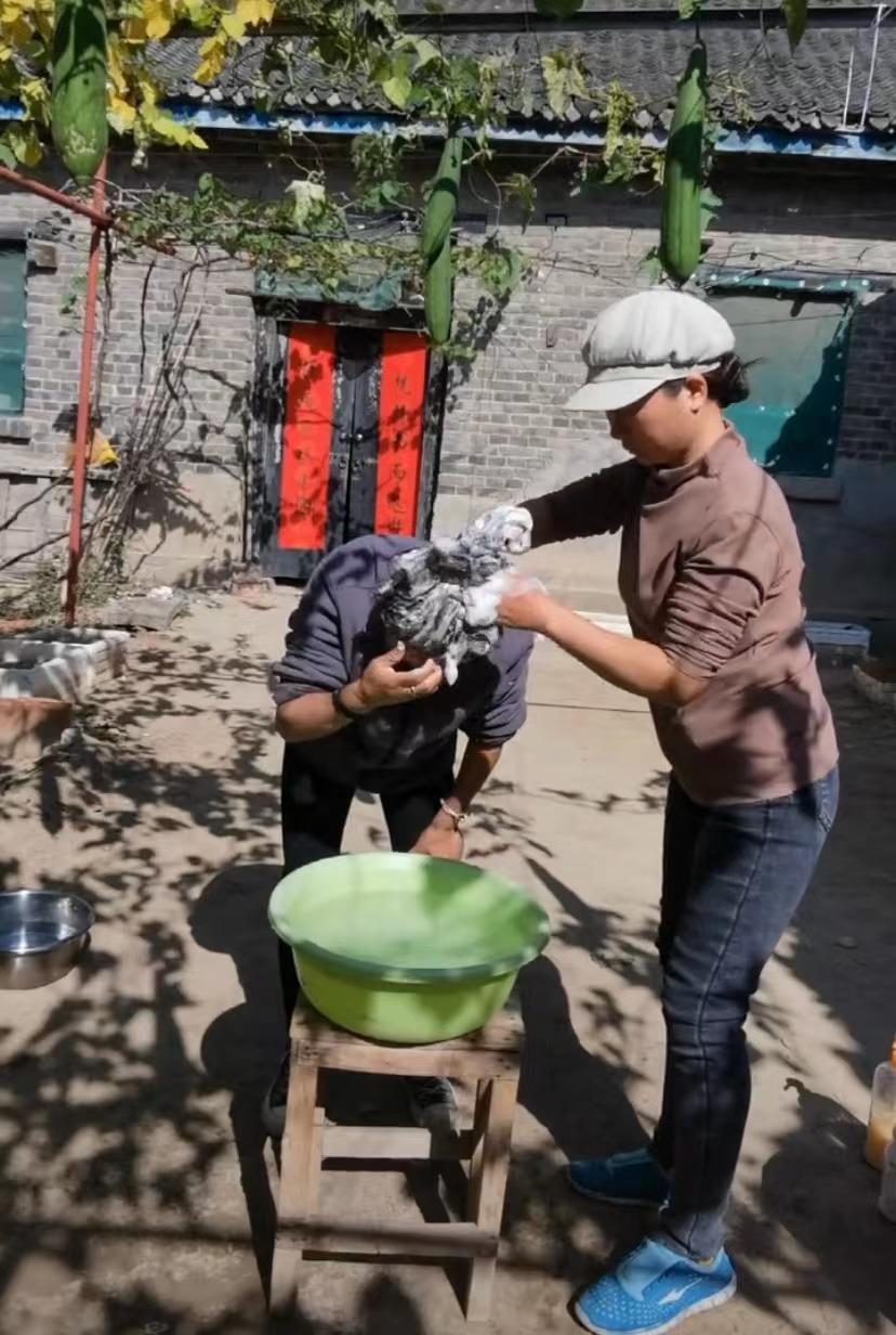 在老家院子里,俞長花人生第一次為母親洗頭。 網(wǎng)絡截圖