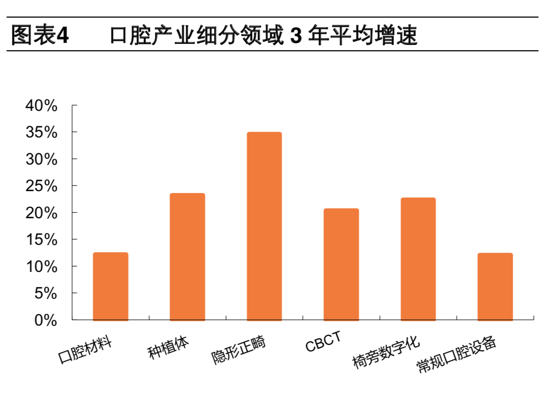 種植、正畸、CBCT 及椅旁數(shù)字化景氣度高。從口腔醫(yī)療患者就診結(jié)構(gòu)來看,牙齒種植患者占比 40.02%,比例高,其次是牙齒正畸及頜內(nèi)正畸,占比 29.88%,兩者合計(jì)占比約 70%,發(fā)展勢頭 迅猛。根據(jù)《視野下的中國口腔產(chǎn)業(yè)趨勢報(bào)告》,口腔上游細(xì)分領(lǐng)域中,種植體、隱形正畸、CBCT 和椅旁數(shù)字化保持高景氣度,3 年增速均值分別為 23.17%、34.59%、20.36%和 22.34%。