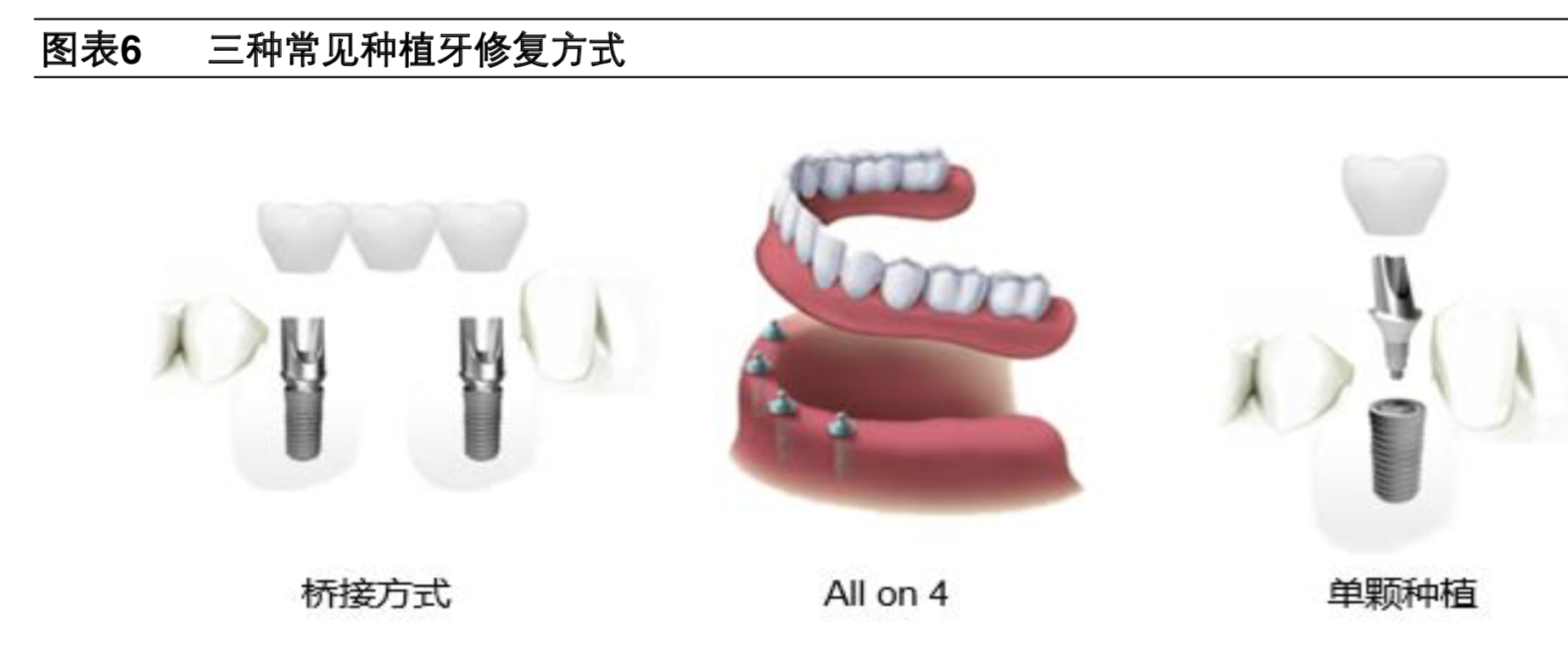通常,種植牙系統(tǒng)由種植體、種植基臺(tái)和牙冠組成,種植體是核心,以“骨結(jié)合”的方式固定在牙 頜骨上,充當(dāng)人工牙根,再通過基臺(tái)與上部的牙冠連接,從而行使功能。一般種植牙分為單顆植入、 橋接植入和 All on 4 全口無牙頜植入三種。