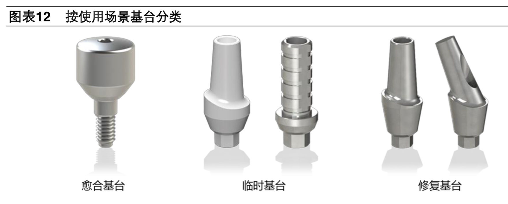 愈合基臺(tái)和臨時(shí)基臺(tái)為終修復(fù)做準(zhǔn)備。在兩段式種植系統(tǒng)中,基臺(tái)與種植體分離,種類繁多。根 據(jù)使用場景,基臺(tái)大體分為愈合基臺(tái)、臨時(shí)基臺(tái)和修復(fù)基臺(tái)。其中愈合基臺(tái)的主要作用是為修復(fù)基 臺(tái)準(zhǔn)備位點(diǎn)并在種植體周圍形成組織袖口。愈合基臺(tái)的選擇主要取決于軟組織的厚度;臨時(shí)基臺(tái)則 是用于臨時(shí)義齒的固定,有利于形成齦溝和牙間乳頭;修復(fù)基臺(tái)是通過連接種植體來支持或固位修 復(fù)體,用于恢復(fù)牙列缺失。與修復(fù)基臺(tái)相比,臨時(shí)基臺(tái)更多使用聚醚醚酮(PEEK)材料,易于椅旁 調(diào)改,且成本較低。