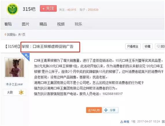 記者注意到,2017年,有網(wǎng)友在百度“315”貼吧里舉報口味王做虛假促銷廣告,舉報內(nèi)容稱:“口味王青果檳榔為了增大銷售量,進(jìn)行了虛假促銷活動。15元口味王系列壹等獎其獎品是:加2元兌換20元口味王檳榔1包,活動開始以來,我從來沒見‘20元口味王檳榔’是什么樣子,連續(xù)2個月中獎的獎牌都換15元的檳榔了,這能叫消費者高興嗎?”該網(wǎng)友還質(zhì)問,身為大企業(yè),口味王怎么出現(xiàn)欺詐消費者的行為?