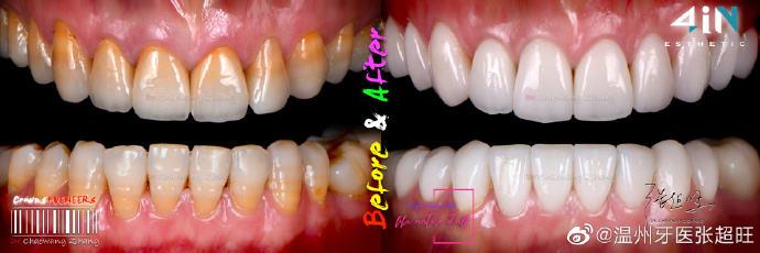 瓷貼面+全瓷冠美學修復前后對比。牙齒美白,還有很多不損害牙齒的有方法。/@溫州牙醫(yī)張超旺