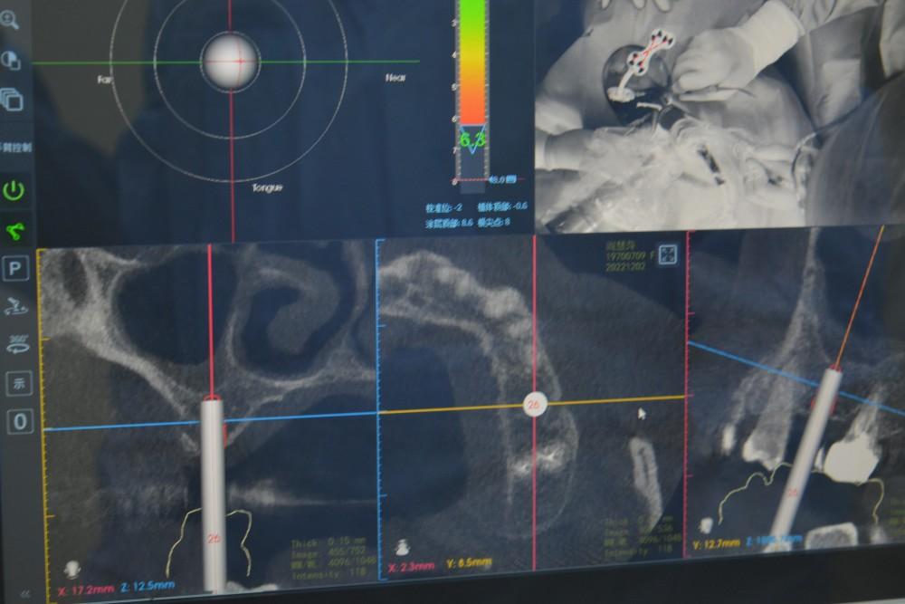 此次手術(shù),術(shù)前的方案設(shè)計由交大口腔杜良智副主任醫(yī)師團(tuán)隊及省二院口腔科朱文忠主任團(tuán)隊共同商議制定。手術(shù)由杜良智副主任遠(yuǎn)程控制機(jī)器人,并指導(dǎo)省二院團(tuán)隊實(shí)施手術(shù)。借助專用軟件系統(tǒng),進(jìn)行種植體三維位置體外可視化模擬,充分了解患者植骨區(qū)密度較差、根尖區(qū)牙槽骨局部凹陷、附著齦薄等情況,制定了詳細(xì)手術(shù)方案。手術(shù)中,借助光學(xué)跟蹤定位儀,引導(dǎo)機(jī)器人機(jī)械臂按預(yù)設(shè)模擬方案在術(shù)中實(shí)現(xiàn)定位、動態(tài)導(dǎo)航、人機(jī)隨動,快速而準(zhǔn)確地將種植體植入到術(shù)前模擬確定的位置。手術(shù)過程高,操作時間大大縮短。術(shù)后,患者表示在調(diào)節(jié)過程中時間短且很輕松,對調(diào)節(jié)果也十分滿意。