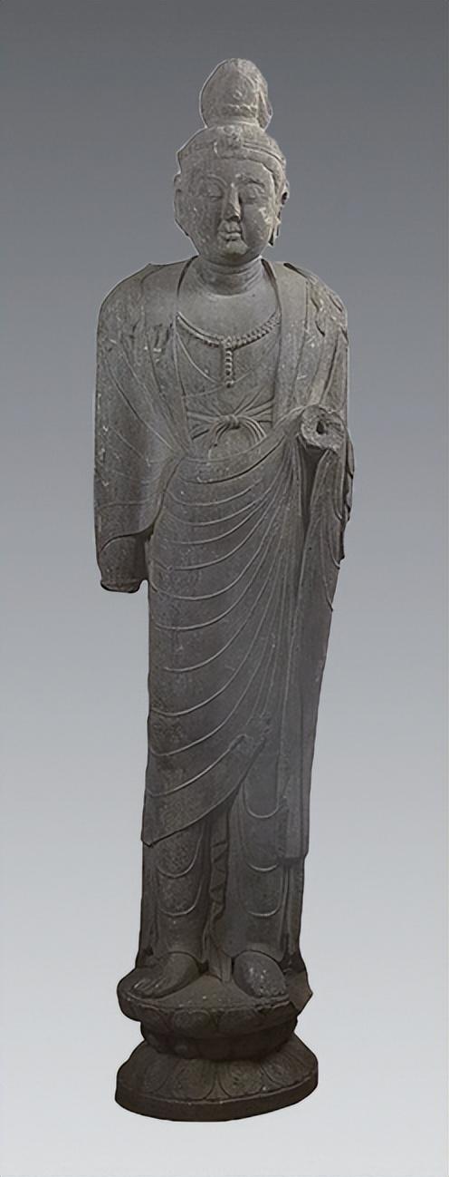 唐代彌勒菩薩石造像是這批造像中的代表性作品。石像為單體圓雕,通高223厘米。菩薩跣足立于束腰仰覆蓮座上,身材修長(zhǎng),衣飾簡(jiǎn)潔,臉龐圓潤豐滿,神情沉靜安詳,堪稱佛教造像莊嚴(yán)美和典型美的結(jié)合。造像比例合度,雕刻刀法圓潤純熟,體現(xiàn)了較高的藝術(shù)造詣。