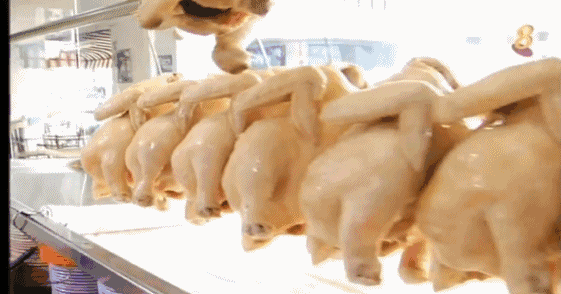 一道上好的白切雞每個(gè)流程都得上心,放血、拔毛、烹飪每個(gè)環(huán)節(jié)都有訣竅,一不小心就破壞雞肉的原味。烹飪時(shí)用豬大骨加海味混合熬煮的高湯浸熟,在浸熟的過程中得每1分鐘撈起來過一遍冷水,雞的每個(gè)部位厚度不同,所以得不停的變換姿勢(shì)浸熟,如此反復(fù)幾次才能完成浸泡流程,浸泡完成之后還不能急著吃,得先冷卻半個(gè)小時(shí)左右,這樣才完成了一道的白切雞。