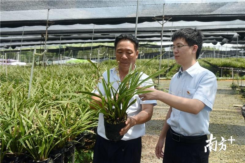 在鄔國良巡查田間的同時,龍門縣龍?zhí)镦?zhèn)李洞村的貧困戶梁仙和其他工人一道,為龍門縣蘭花產(chǎn)業(yè)園搭建培育蘭花的架子。而在另一側(cè),一盆盆蘭花已經(jīng)開花,花盆高出地面50厘米,以便遠離濕氣和蟲害,擺放得整整齊齊。