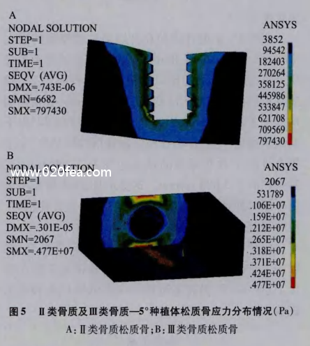 在Ⅱ類骨質(zhì)中,松質(zhì)骨的大應(yīng)力分布于種植體的底部(下方的螺紋處),而在Ⅲ、V類骨質(zhì)中種植體周圍松質(zhì)骨應(yīng)力分布較均勻,但在密質(zhì)骨與松質(zhì)骨交界處出現(xiàn)了應(yīng)力較集中的區(qū)域。同一骨質(zhì)不同角度的種植體松質(zhì)骨應(yīng)力分布情況基本相同。見圖5。