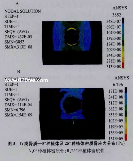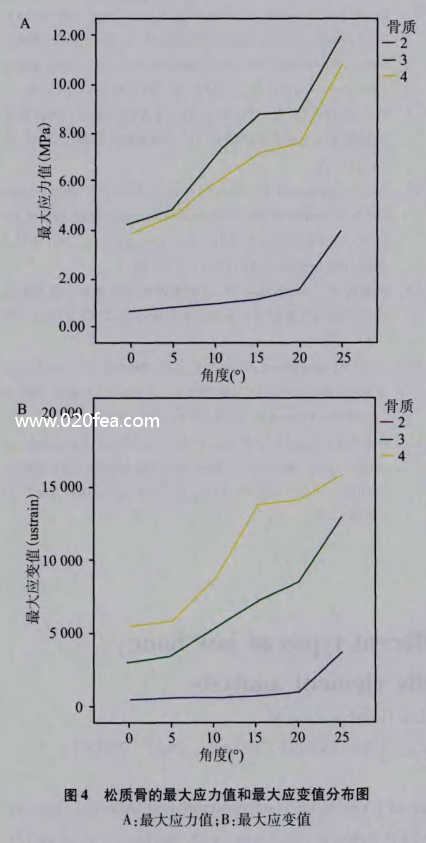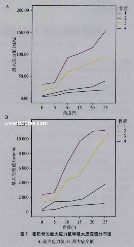 實(shí)驗(yàn)中,I類骨質(zhì)的6種傾斜種植模型的大應(yīng)變?yōu)?200ustrain,低于3000ustrain,說明I類骨質(zhì)可進(jìn)行25。以下的傾斜種植。Ⅱ類骨質(zhì)中25。傾斜種植的模型的大應(yīng)變?yōu)?752ustrain,其余模型均低于3000ustrain,因此Ⅱ類骨質(zhì)可進(jìn)行20。以下的傾斜種植。Ⅲ、Ⅳ類骨質(zhì)傾斜種植的模型中,除了Ⅲ類骨質(zhì)0。種植模型的大應(yīng)變?yōu)?769ustrain,其余均高于3000ustrain。這提示Ⅲ、Ⅳ類骨質(zhì)不適用于傾斜種植,同時(shí),當(dāng)Ⅳ類骨質(zhì)進(jìn)行垂直種植時(shí),也建議其首先增加骨密度。