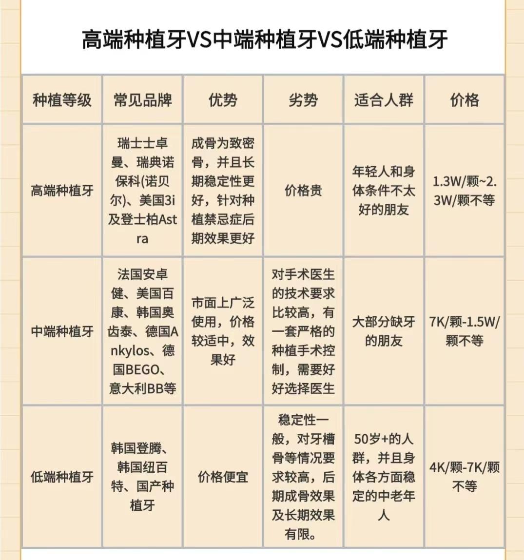 下面兩張圖總結(jié)下低中高端種植牙在品牌和價格方面的區(qū)別(價格圖片是我面診其中的一家公立醫(yī)院的價目表,不同醫(yī)院價格可能不一樣,這張只供參考)