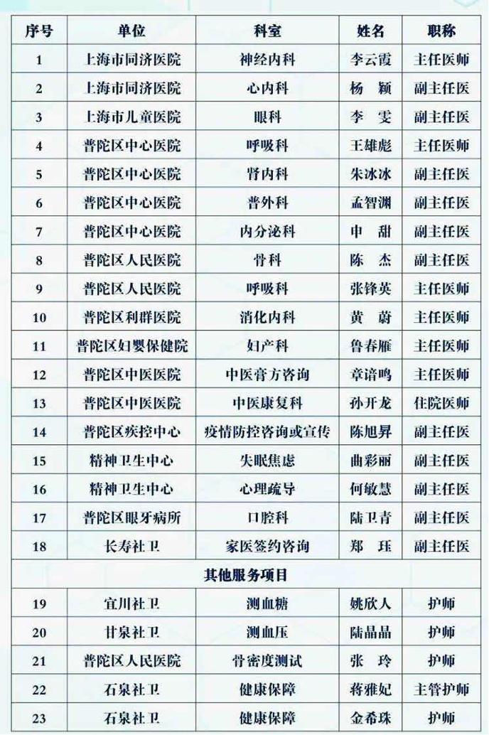 當天,來自上海市同濟醫(yī)院、上海市兒童醫(yī)院、普陀區(qū)中心醫(yī)院、普陀區(qū)人民醫(yī)院、普陀區(qū)利群醫(yī)院、普陀區(qū)婦嬰保健院、普陀區(qū)中醫(yī)醫(yī)院、普陀區(qū)疾控中心、精神衛(wèi)生中心、普陀區(qū)眼牙防治所、長壽社衛(wèi)等的“大咖”們將現(xiàn)身坐堂。