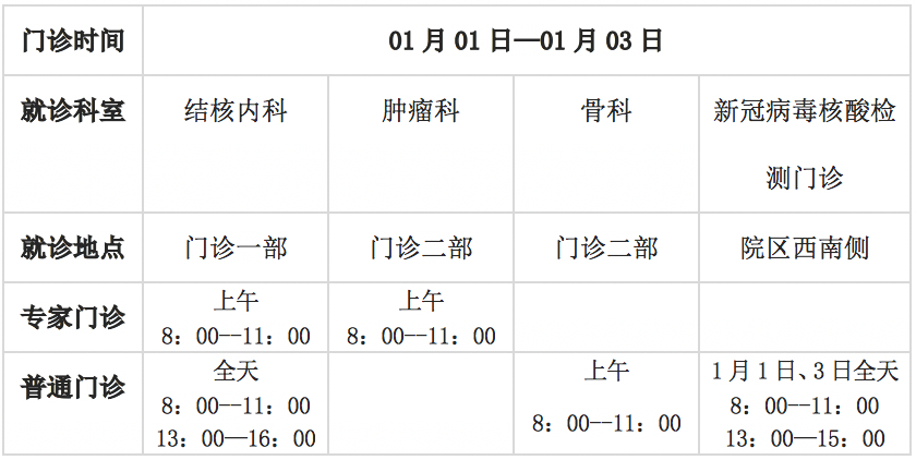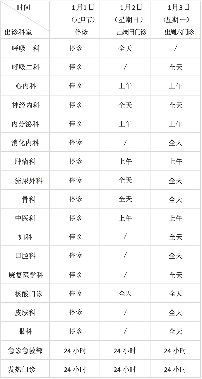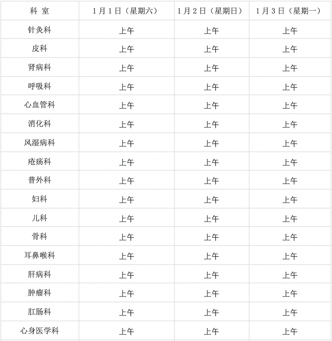 1、腫瘤科、鎮(zhèn)痛門診,出診時間為1月2日上午半日;神經(jīng)外科、血管外科門診、風(fēng)濕科出診時間為1月3日上午半日;腎內(nèi)科門診出診時間為1月1日上午半日、1月3日上午半日;