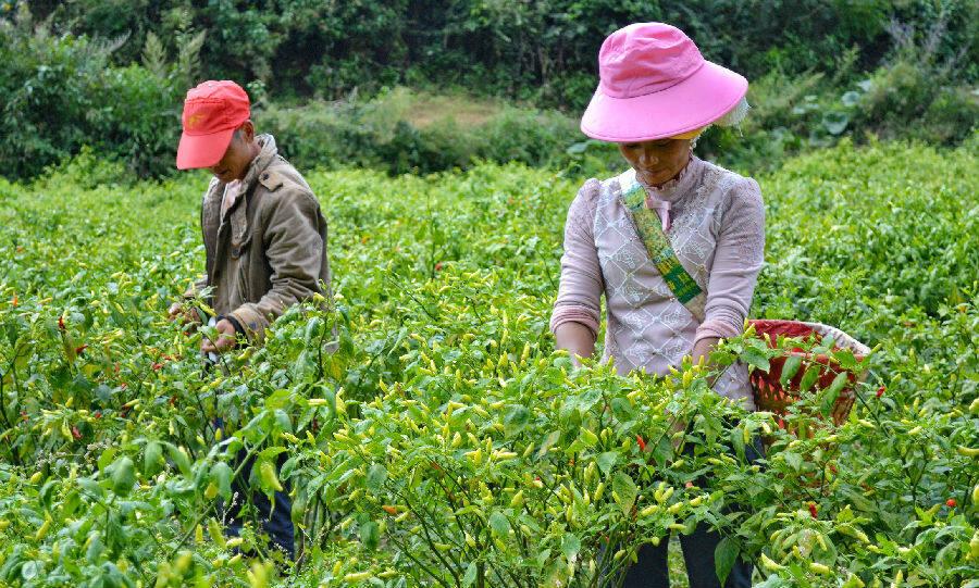 圖為五山鄉(xiāng)中寨村的種植戶在小米辣種植基地采摘小米辣(趙樹(shù)龍 攝)