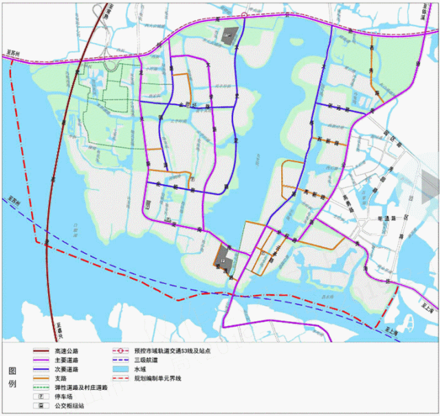 城市道路交通系統(tǒng):規(guī)劃區(qū)內(nèi)城市道路形成“三橫三縱”的主要路網(wǎng)結(jié)構(gòu)。