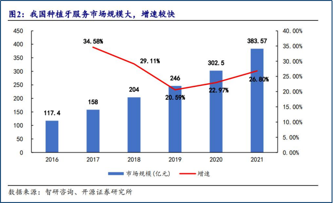 從市場(chǎng)規(guī)模來看,據(jù)智研咨詢數(shù)據(jù),2021年國內(nèi)種植牙服務(wù)市場(chǎng)規(guī)模已超380億元,市場(chǎng)需求居高不下。