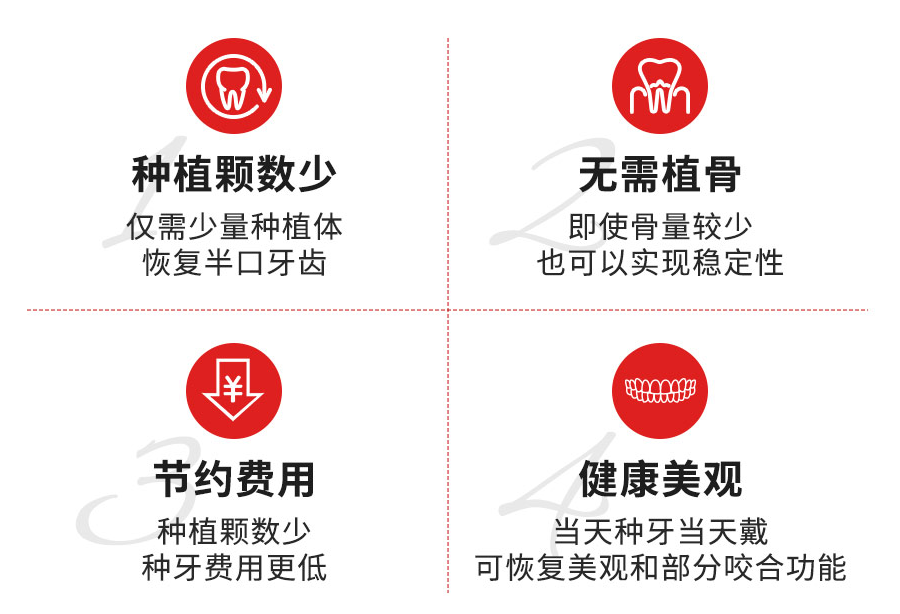 口腔種植牙是在牙齒缺失的情況下,僅利用4—6顆種植體,種出整排牙。所有種植修復(fù)步驟當(dāng)天完成,實(shí)現(xiàn)“即拔、即種、即用”,種植當(dāng)天恢復(fù)咀嚼功能,恢復(fù)飲食。