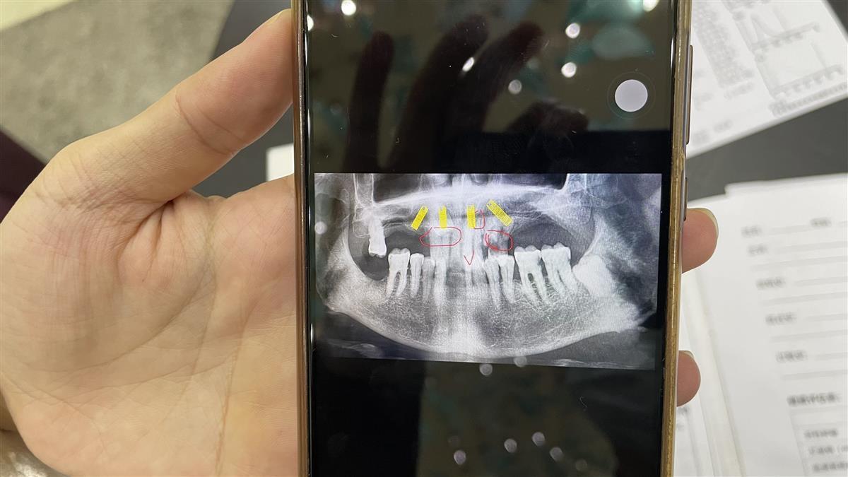 當(dāng)日,極目記者趕到武漢華美整形醫(yī)院,當(dāng)時(shí)接待周爹爹的平女士介紹,經(jīng)CT片和現(xiàn)場(chǎng)檢查綜合診斷,周爹爹的上半口牙的前牙區(qū)的8顆牙,有3顆牙已經(jīng)缺損,有2顆松動(dòng)預(yù)計(jì)一年半載后也會(huì)出現(xiàn)缺損,余下的3顆,2顆牙為埋伏牙(可理解為殘牙、殘冠),1顆好牙,而周爹爹同意的種植牙方案為對(duì)其上齒部分前牙區(qū)種植4顆恢復(fù)上半口14顆牙的半固定修復(fù),這需要對(duì)上半口前牙區(qū)的牙齒全部拔除才能處理,所以醫(yī)生才對(duì)上半口前牙區(qū)的8顆牙全部進(jìn)行了拔除。