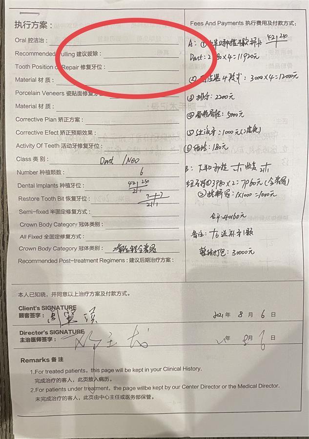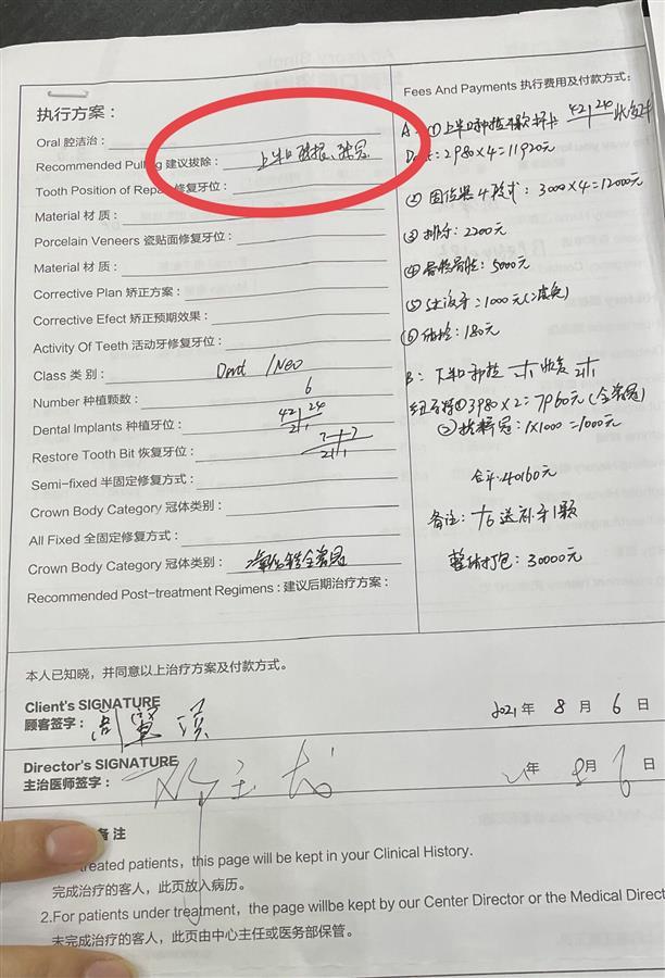 平女士還出示相應(yīng)病歷資料稱(chēng),8月6日,醫(yī)院與周爹爹簽定的種植執(zhí)行方案中,明確建議拔除(周爹爹)上半口的殘牙、殘冠,周爹爹也同意該執(zhí)行方案并簽名。