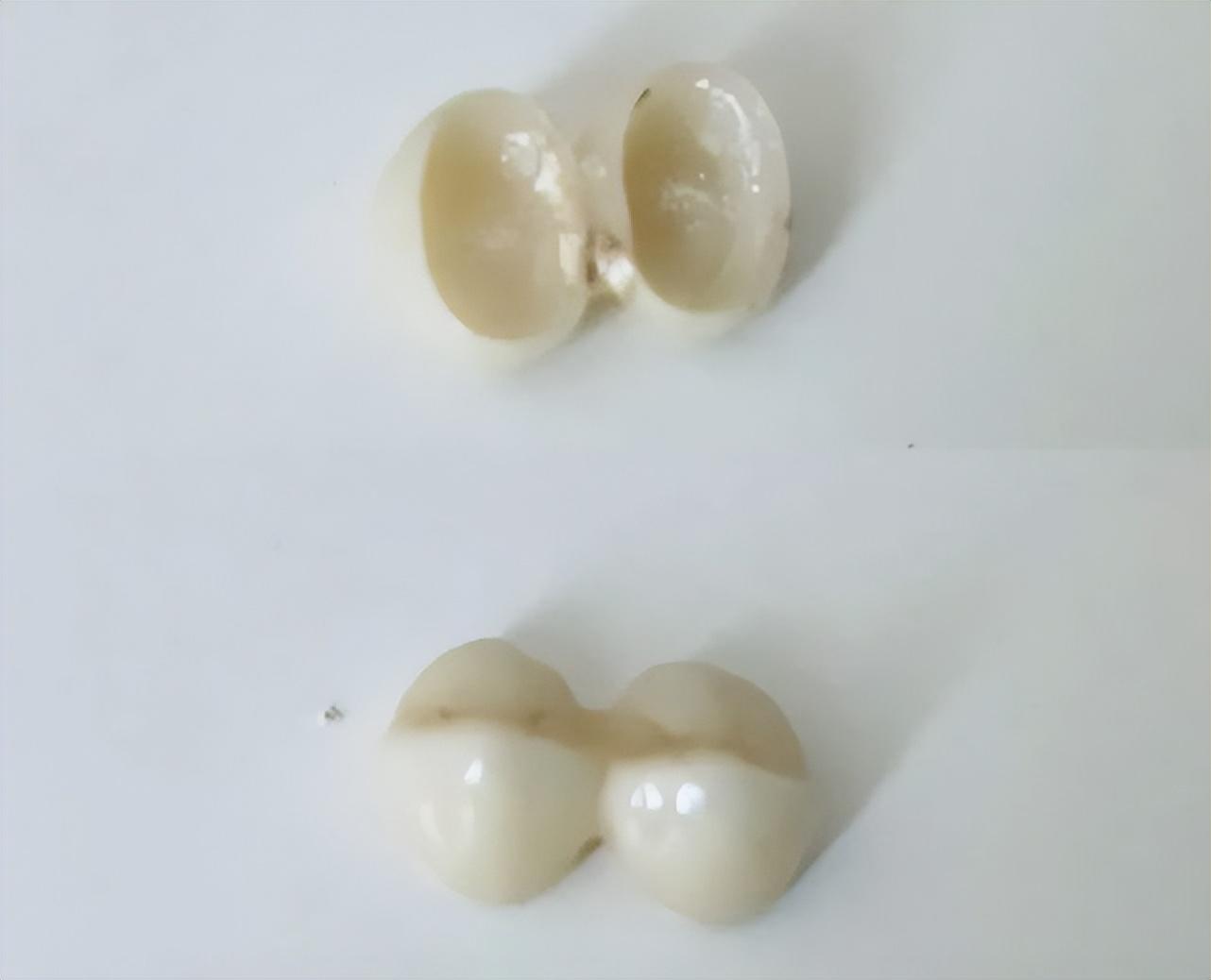 受訪者楊帆脫落的連體牙冠(右上3、4)