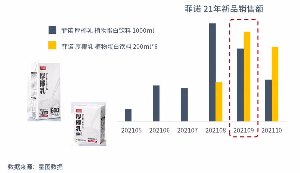 菲諾乘勝追擊,迅速發(fā)起C端的布局,2021年5月份即在天貓、京東上線1L裝厚椰乳單品。為了更好地迎合C端消費者的需求,同年8月又推出200ml的小規(guī)格包裝,次月便在銷量上勝過了1L裝的單品,成為其主力銷售產(chǎn)品。