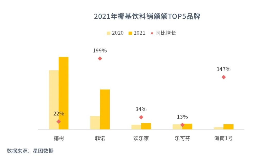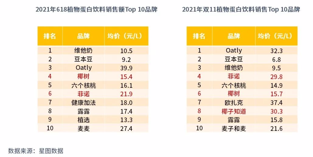 其實對于椰子類飲料,大家并不陌生,不過此前被人們廣為熟知的是海南椰樹集團旗下的椰樹牌椰汁,其產(chǎn)品從上市至今已走過34年,獨樹一幟的包裝風格給消費者留下了深刻的印象,一度造就了“南椰樹,北露露”的植物蛋白飲市場格局。2021年618,椰樹在植物蛋白飲料的銷售額排第四,細分到具體子類,彼時椰樹仍是椰基飲品領(lǐng)域的銷冠。