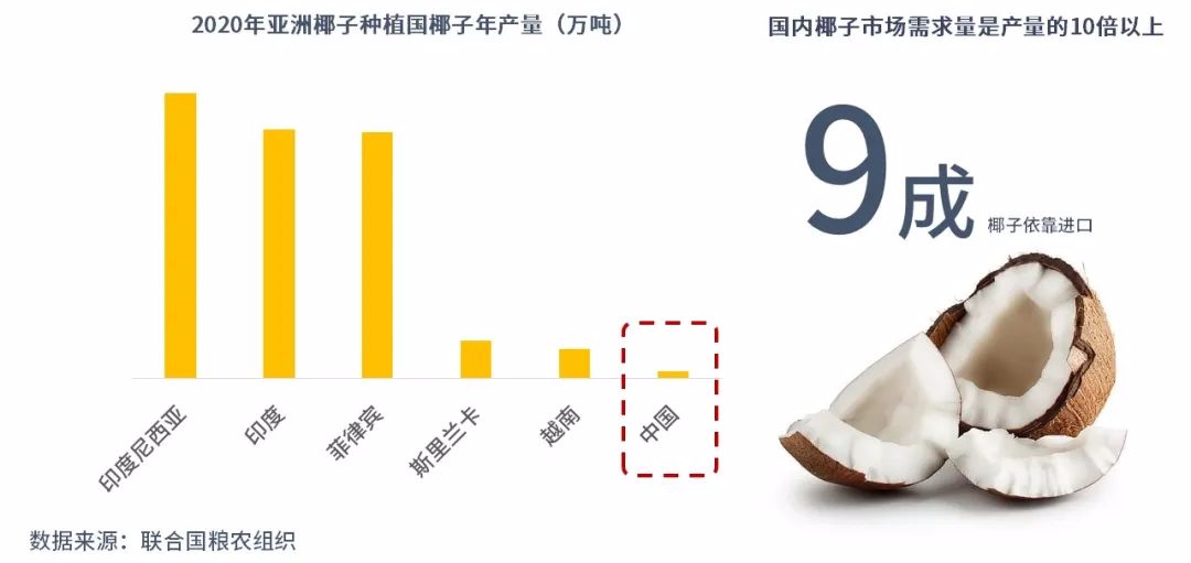 根據(jù)聯(lián)合國糧農(nóng)組織數(shù)據(jù),中國椰子種植面積僅占的0.29%,占亞洲的0.32%。僅靠中國的產(chǎn)量根本無法滿足龐大的市場需求,因此國內(nèi)有9成的椰子靠進口。受疫情影響,進口船期的延長、長途運輸過程中椰子的破損率提高,無形中也推高了企業(yè)的成本。供應鏈是所有新老品牌都會面臨也需攻克的難題。