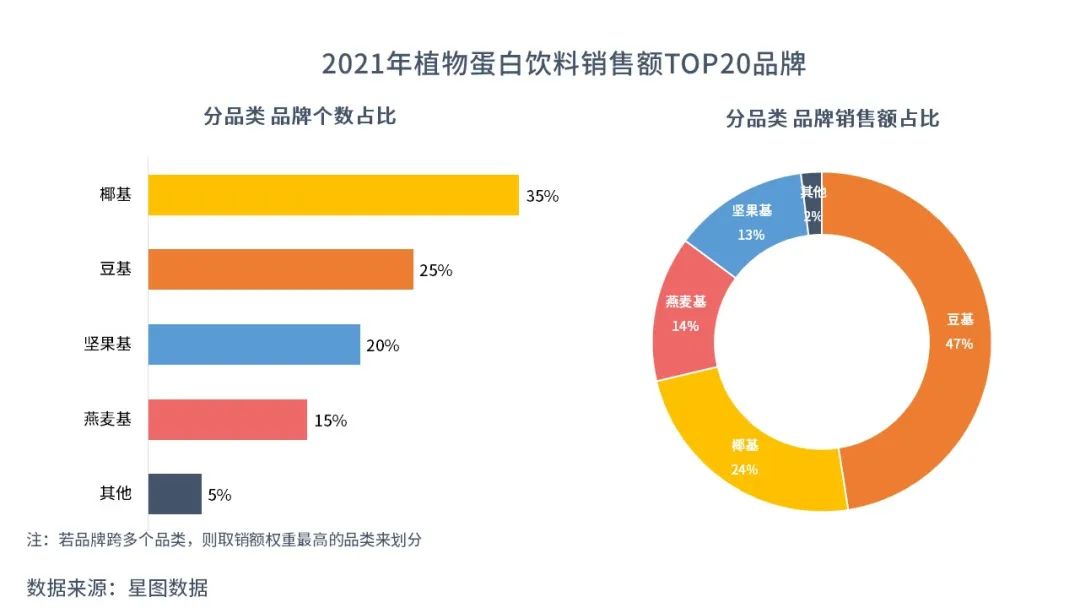 從2021年銷額排名前20的植物蛋白飲料品牌來看,椰基品牌數(shù)量占比多,為35%;而其品類銷售額也超過了之前大熱的燕麥奶。