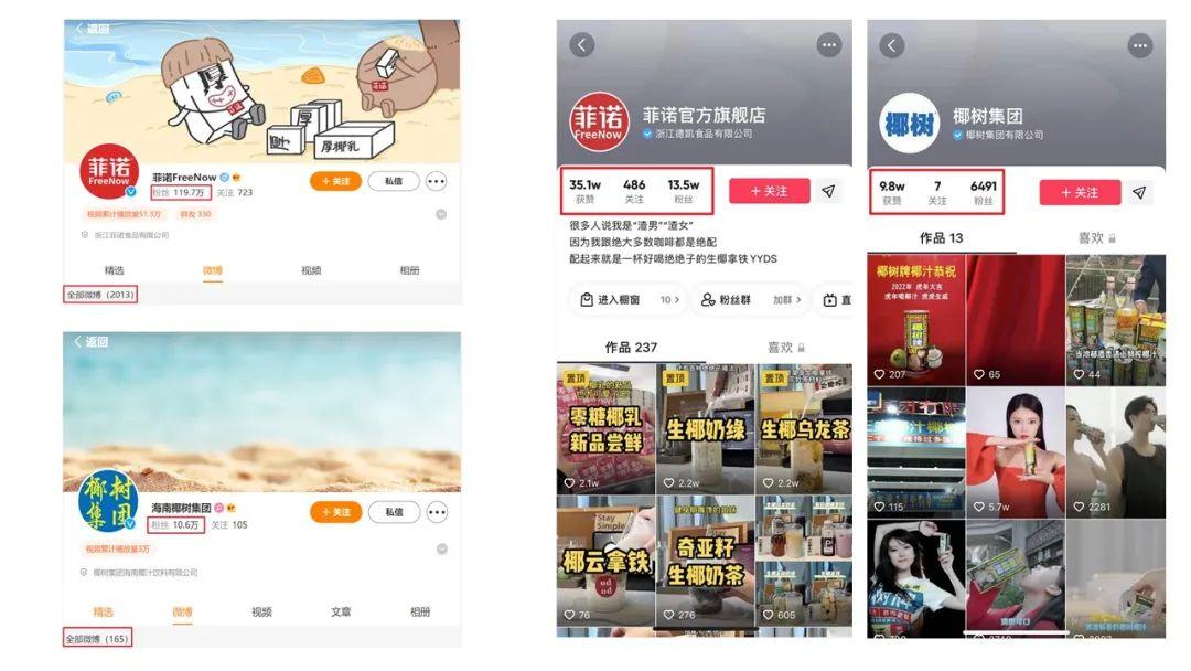 二是重視官方微信號、微博號、抖音號等社交媒體的運營,保持一定的內(nèi)容輸出以及互動,增加用戶對品牌的興趣。截至4月13號,菲諾的微博顯示,共發(fā)布2013條微博,粉絲119.7萬,其抖音作品數(shù)量237條,粉絲13.5萬;對比之下,椰樹發(fā)布的微博共計165條,粉絲10.6萬,其抖音作品13條,粉絲6491。