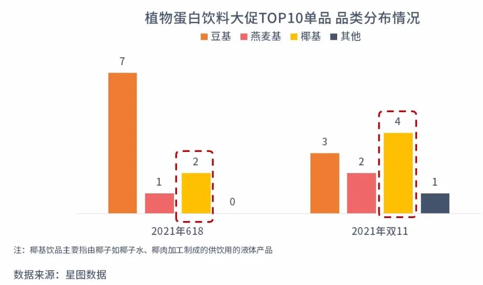 菲諾的快速出圈也再次掀起了椰子類飲品的熱潮。在2021年618,在植物蛋白飲銷售額TOP10單品中,椰基類占2個,而到了雙11,椰基飲品超越豆基飲品,成為上榜多的單品。