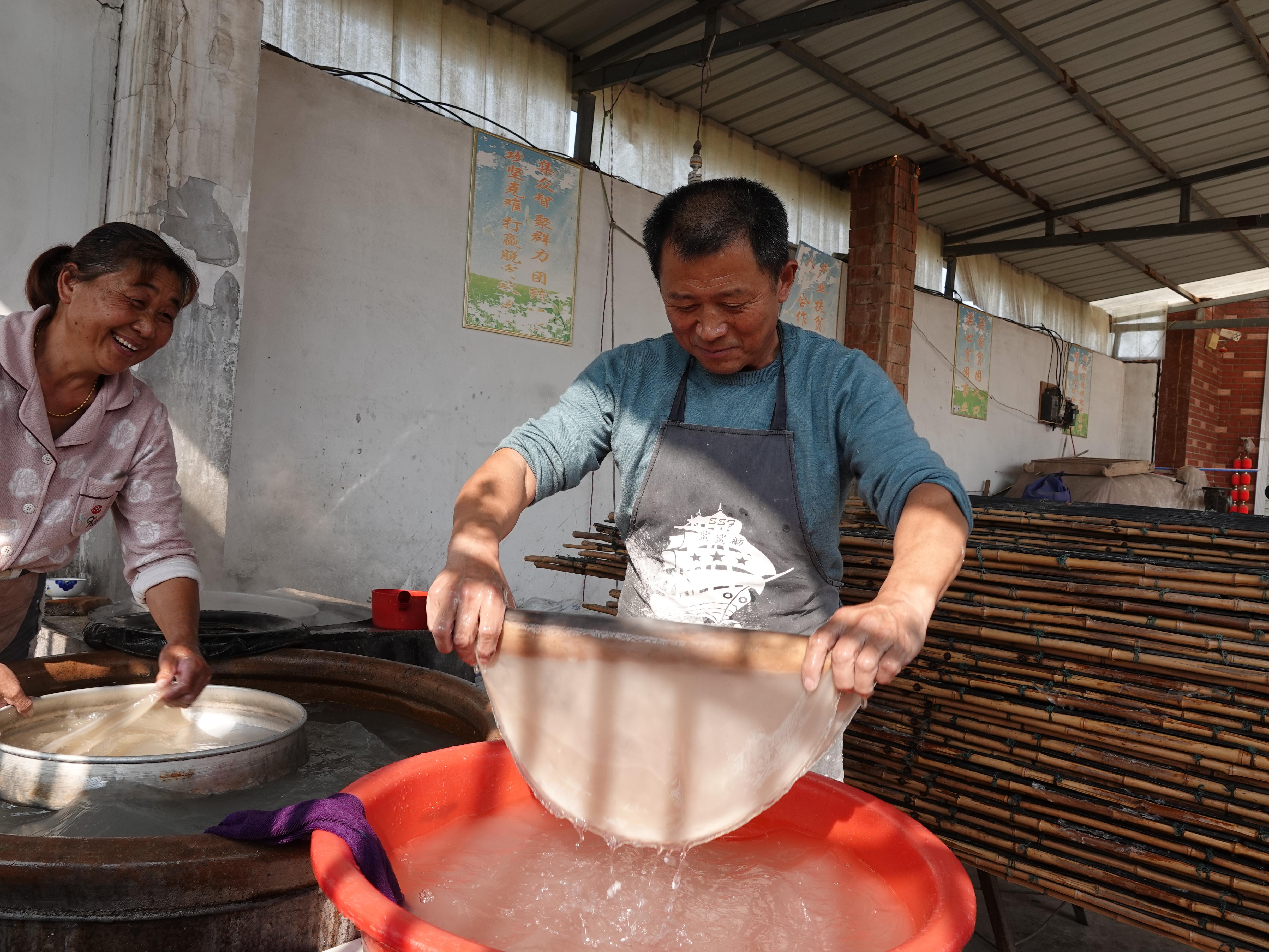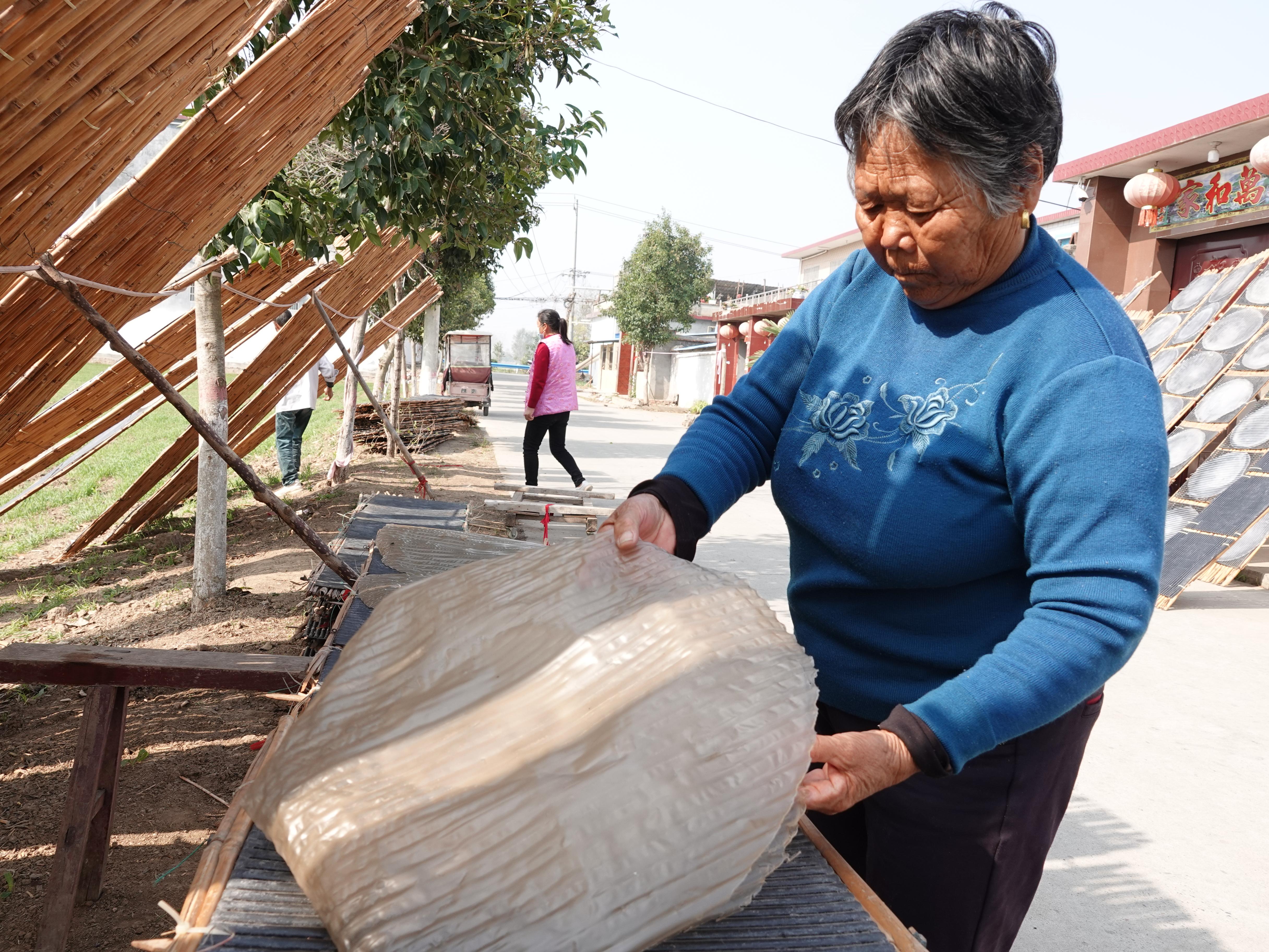 緊臨呂彩蘭家粉皮加工作坊的麥田邊上,豎滿了攤曬著張張粉皮的簾子。正在搬運、晾曬粉皮的村民楊愛軍說:“我家地方小,又缺少勞力。因為我們兩家是左右鄰居,這幾年鄰里之間守望相助,合伙抱團加工粉皮,日子確實越過越舒心。”