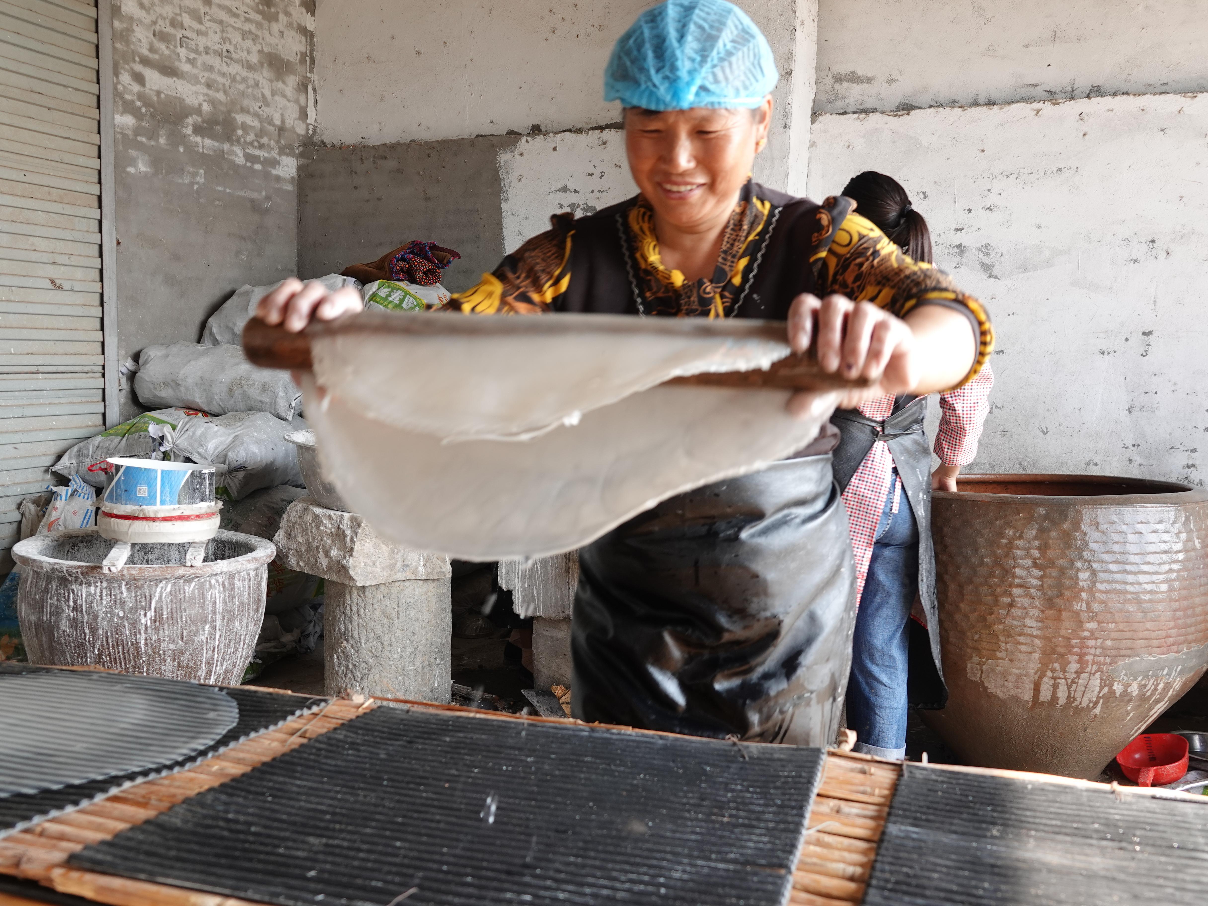 “我做粉皮好多年了,以前手工做,現(xiàn)在機械生產(chǎn),產(chǎn)量更高益更好。想要做好粉皮,從優(yōu)質紅薯品種栽培、紅薯淀粉加工到粉皮制作、晾曬,每一個步驟都不能馬虎?!碧崞鹫ψ龇燮ぃ庸ご髴魲畎l(fā)展娓娓道來。“平均每三斤紅薯可加工一斤淀粉,一斤淀粉可加工9兩多粉皮,一斤粉皮可賣10元左右,經(jīng)濟益還算比較可觀?!?/p>