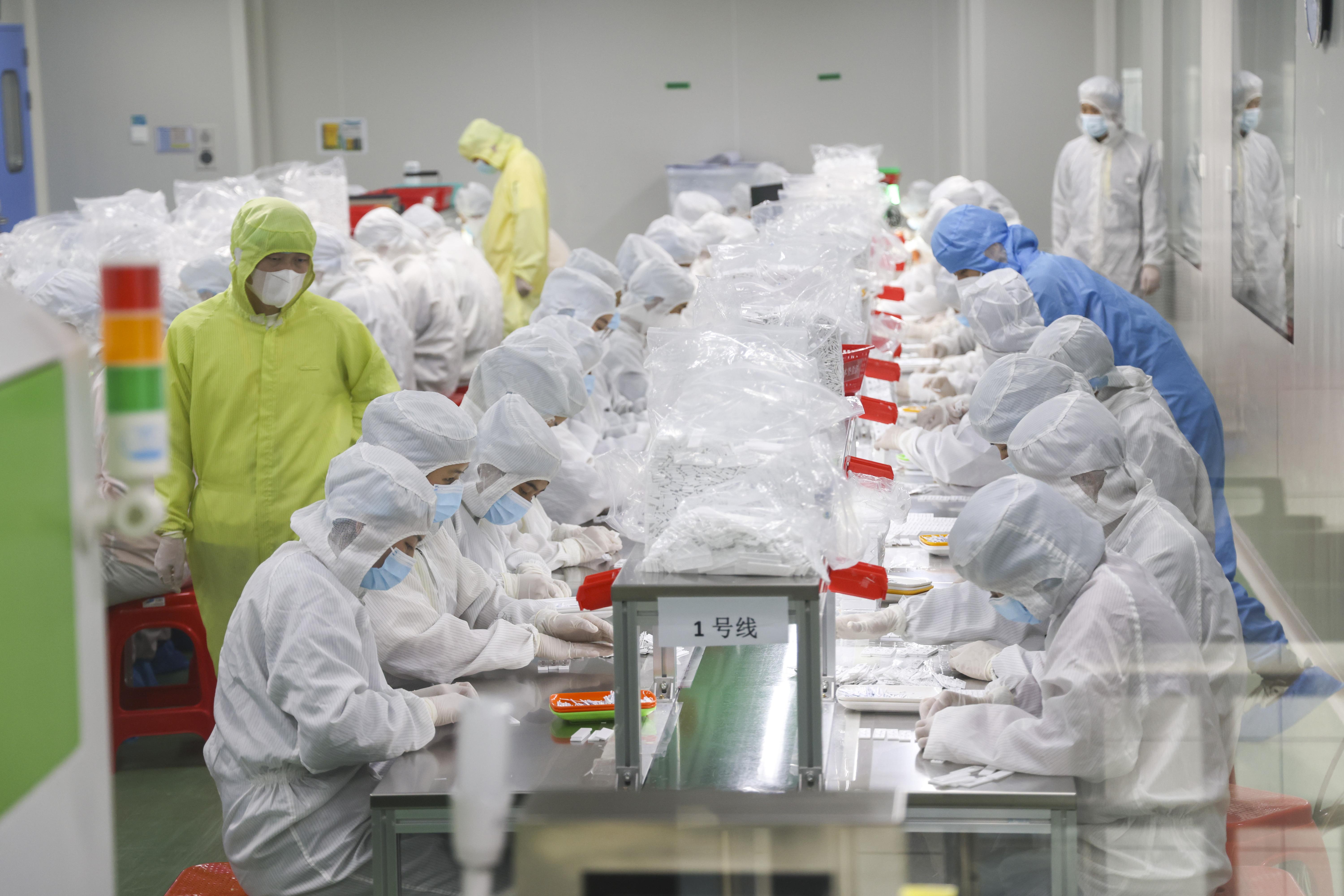 12月21日,深圳企業(yè)亞輝龍生產(chǎn)車間,工人們忙碌不同,正在加快生產(chǎn)新冠抗原檢測試劑。 南方日報記者 朱洪波 攝