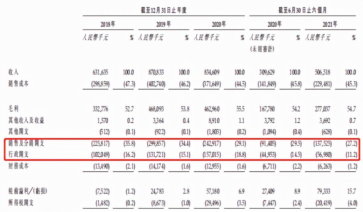 報告期內(nèi),該公司的銷售及分銷開支分別為2.26億元、3億元、2.43億元和1.38億元,分別占當期總營收的35.8%、34.4%、29.1%和27.2%;行政開支分別占同期總營收的的16.2%、15.1%、18.8%、14.5%及11.2%。