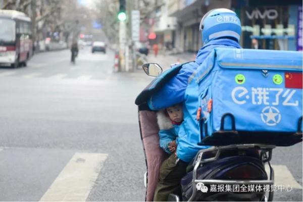 李幫勇抱著不到三歲的女兒送外賣(mài)。