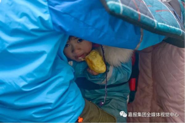 躲在擋風(fēng)被下的女兒沒(méi)有任何玩具,只有一個(gè)干面包。
