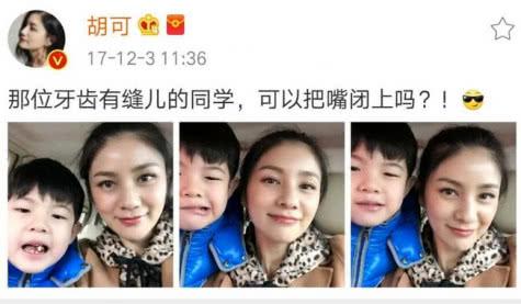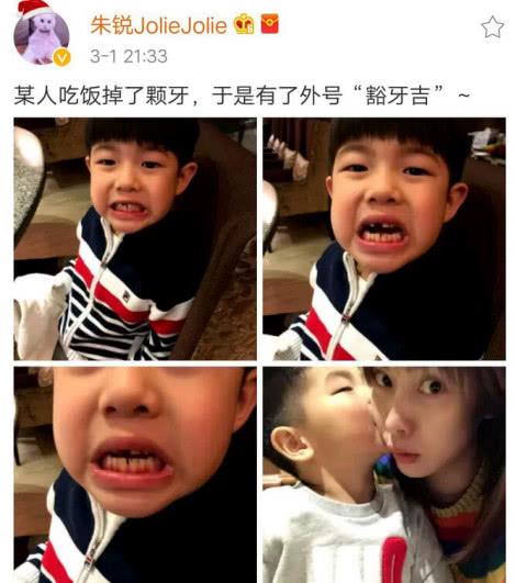 3月1日,胡可的閨蜜、安吉的干媽朱銳在微博上貼出了安吉的照片,并寫道:某人吃飯掉了顆牙,于是有了外號“豁牙吉”。
