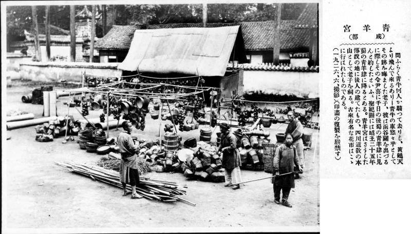 清末青羊?qū)m花會(huì)賣竹器的地?cái)?。來源:鄭光路文物市?chǎng)所購(gòu)日本畫刊