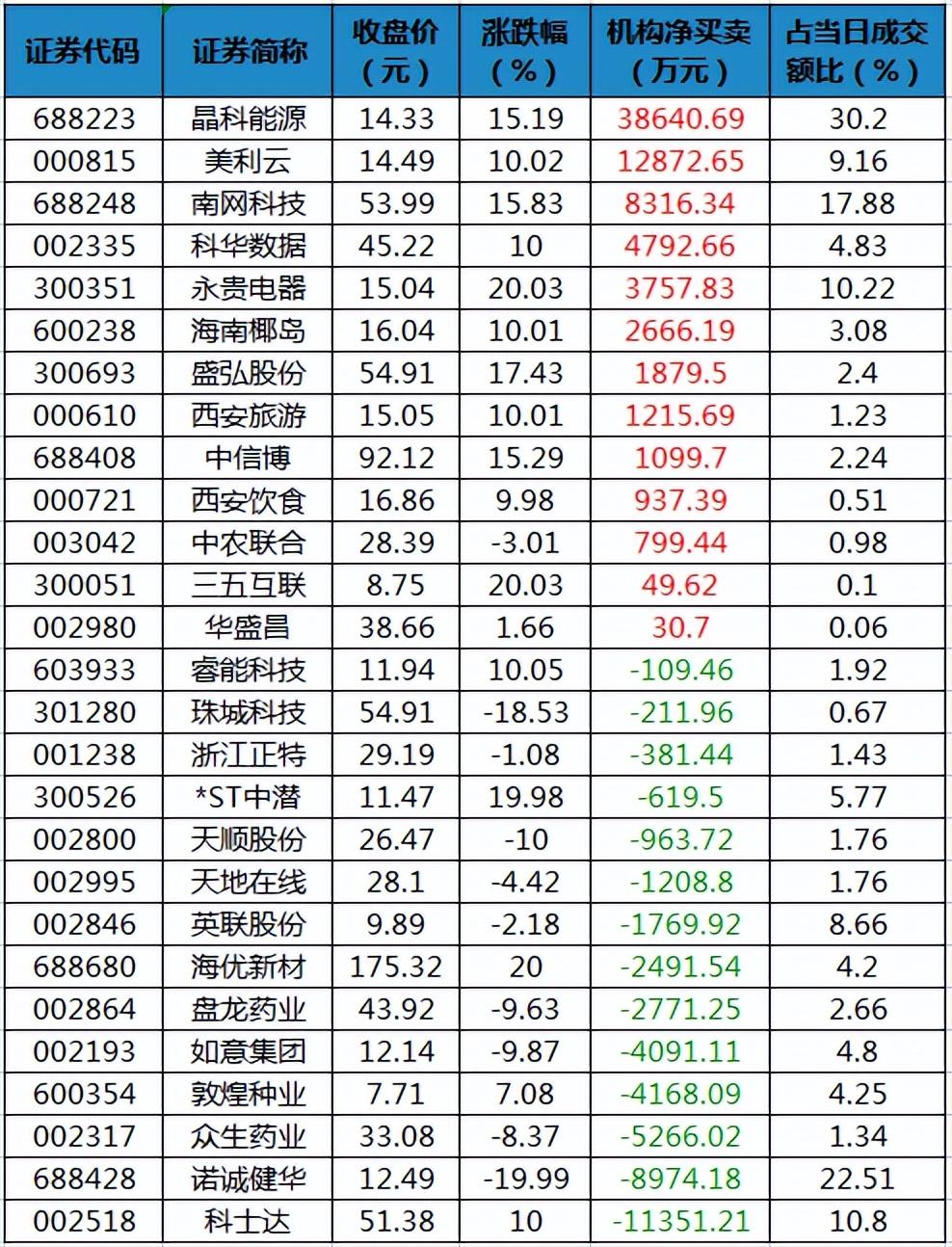 盤后龍虎榜數(shù)據(jù)顯示,周一機(jī)構(gòu)席位資金合計(jì)凈買入約3.27億元。其中,凈買入的個股13只,凈賣出的個股14只。機(jī)構(gòu)凈買入多的股票是晶科能源,凈買入金額約3.86億元;機(jī)構(gòu)凈買入居前的還有美利云、南網(wǎng)科技、科華數(shù)據(jù)等股。機(jī)構(gòu)凈賣出多的股票是科士達(dá),凈賣出金額約1.14億元;機(jī)構(gòu)凈賣出居前的還有諾誠健華、眾生藥業(yè)、敦煌種業(yè)等股。