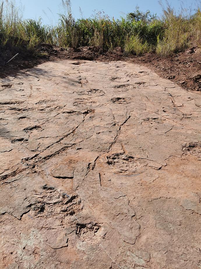 據(jù)介紹,目前,考察隊已在泥質(zhì)粉砂巖或粉砂質(zhì)泥巖層面上清理出恐龍足跡240余枚,包括植食性蜥腳類,大、中、小型鳥腳類,肉食性大型三趾型獸腳類,兩趾型恐爪龍類,小型獸腳類等至少八種造跡者(恐龍)。