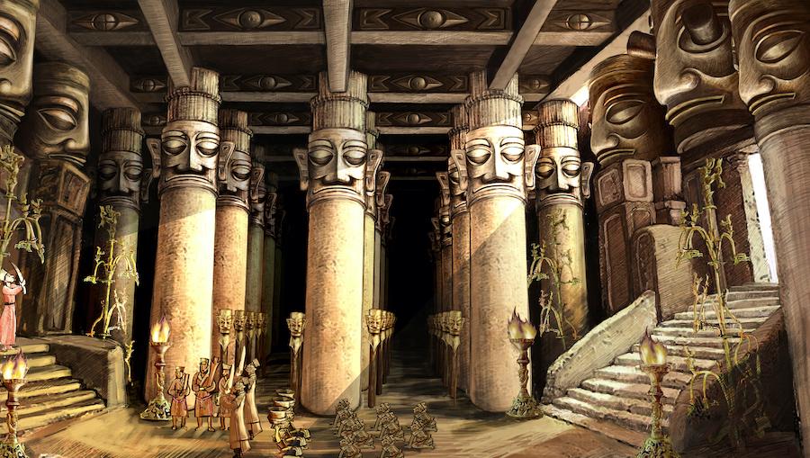 三星堆神廟復(fù)原圖,兩個(gè)祭祀坑中的出土文物,過去可能都是懸掛在宗廟中的。 金磊磊繪、廣西師范大學(xué)出版社 圖