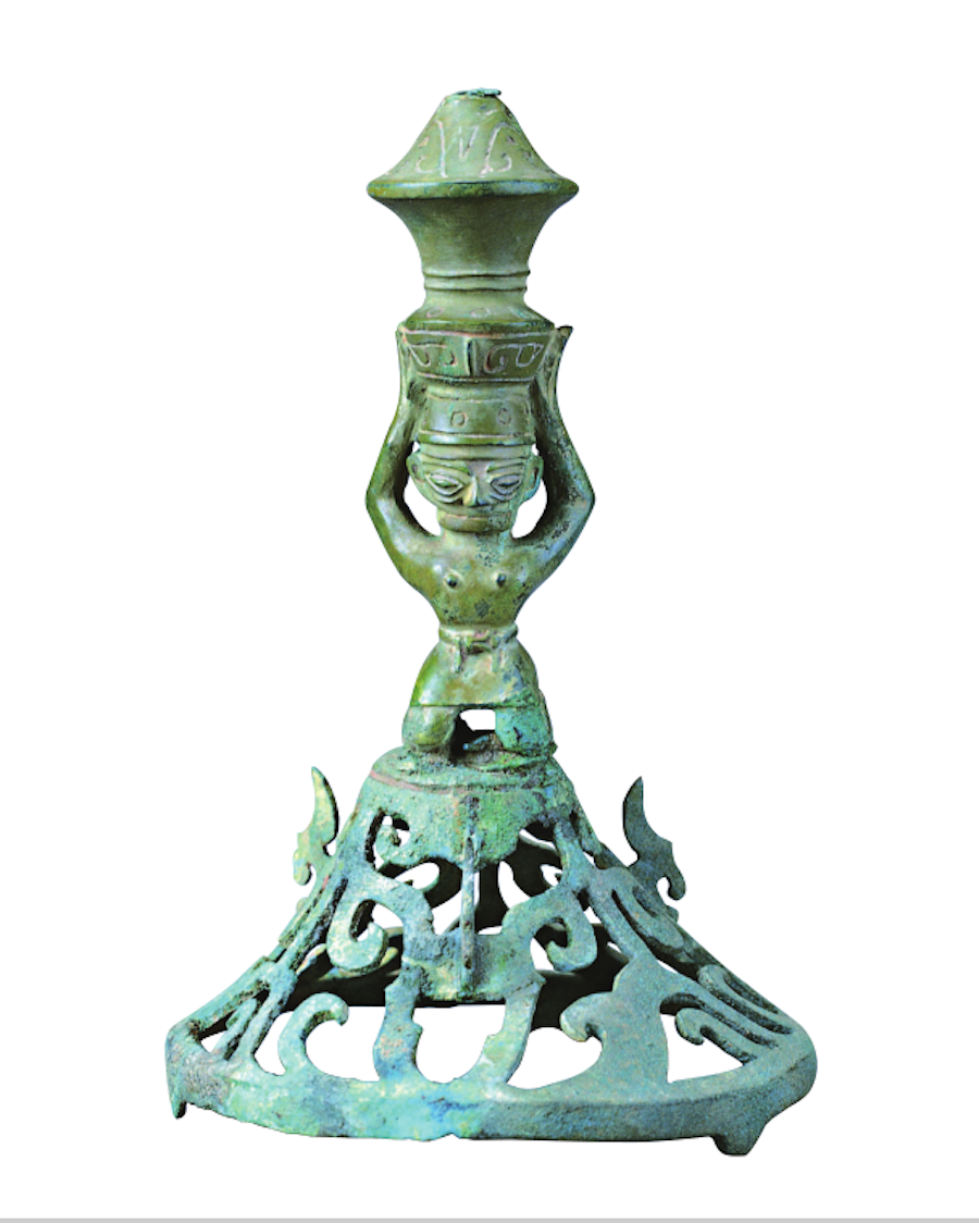 三星堆遺址出土銅喇叭座頂尊跪坐人像。 廣西師范大學(xué)出版社 圖