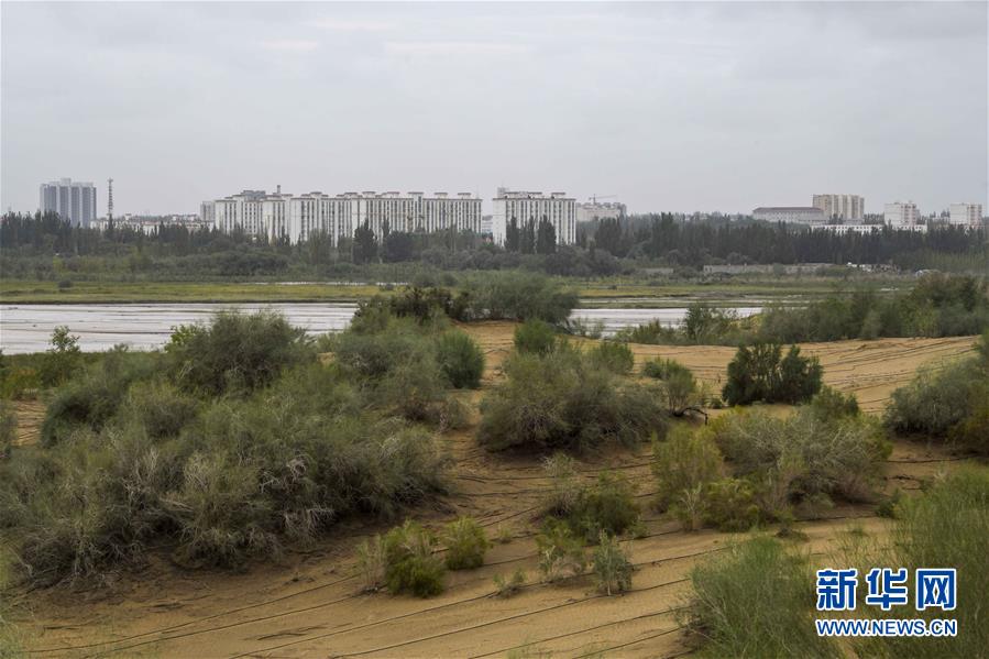 從新疆且末縣車爾臣河以東的防沙治沙綠色長廊遠眺縣城(8月21日攝)。新華社記者 趙戈 攝