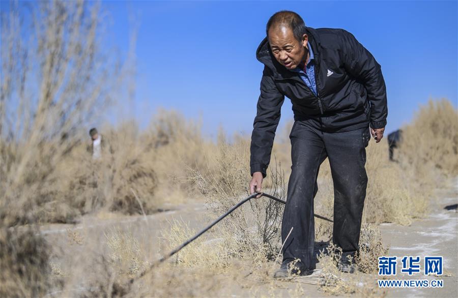 新疆且末縣防風(fēng)治沙站副站長佟戈雁在治沙現(xiàn)場查看滴灌管道的維護情況(11月15日攝)。新華社記者 王菲 攝