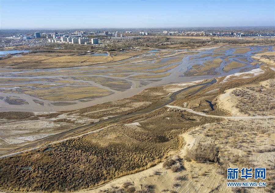 從空中俯瞰位于新疆且末縣境內(nèi)的車爾臣河,以及河?xùn)|的防沙治沙綠色長廊與河西的縣城樓宇(11月15日無人機拍攝)。新華社記者王菲 攝