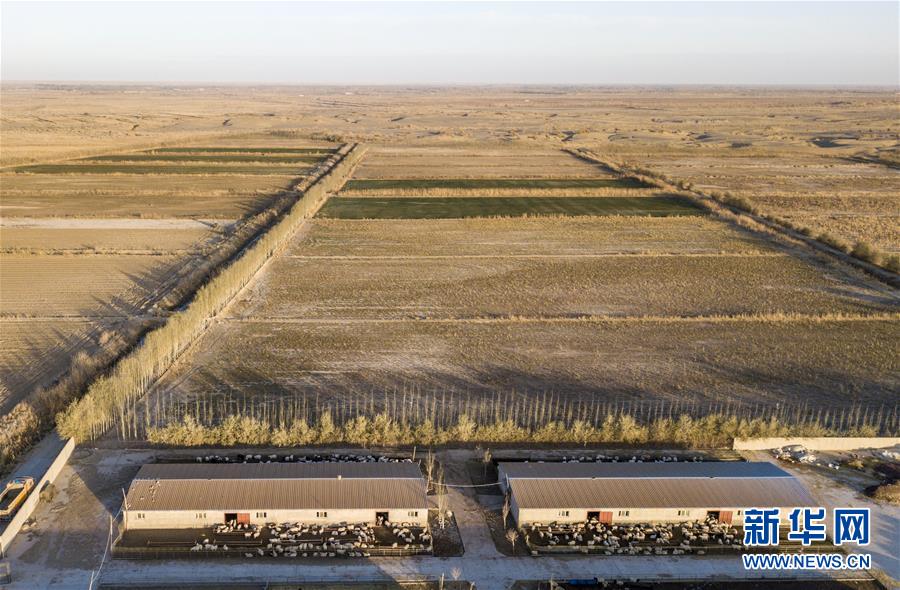 從空中俯瞰蔡振峰家的羊圈和田地,遠處可看到成片的沙漠(11月15日無人機拍攝)。新華社記者 王菲 攝