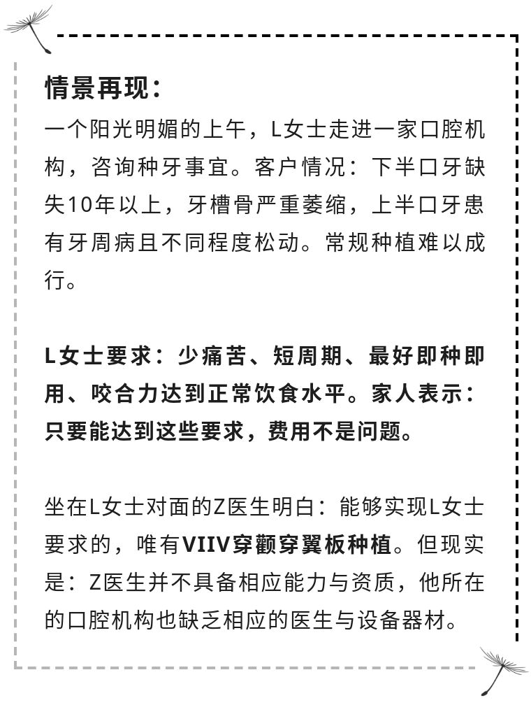 二,將客戶轉(zhuǎn)診給具備相關(guān)醫(yī)療水平的機(jī)構(gòu),利潤(rùn)共享,并申請(qǐng)椅旁學(xué)習(xí),邀請(qǐng)鼎植醫(yī)生來(lái)Z機(jī)構(gòu)帶教,或者參加鼎植VIIV課程系統(tǒng)學(xué)習(xí)……總之就是賺到錢(qián)、學(xué)到技術(shù)、打響招牌。重要的是,L女士缺牙重生,擁抱幸福晚年。