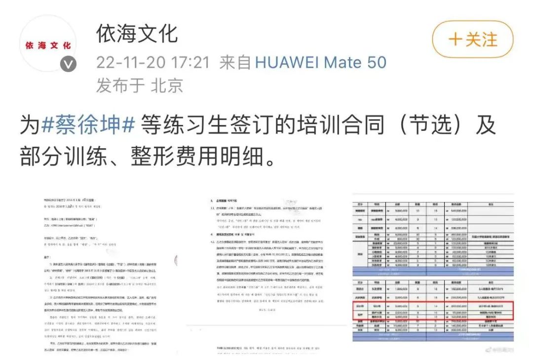 蔡徐坤的前東家依海文化發(fā)微博,曬出了“蔡徐坤等練習(xí)生的部分培訓(xùn)和整形費(fèi)用明細(xì)”。