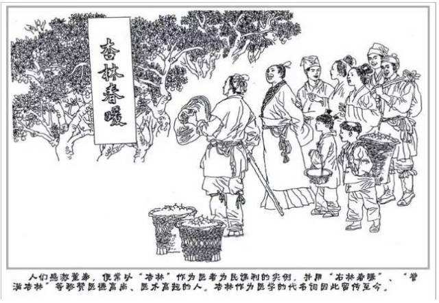 相傳三國時(shí),名醫(yī)董奉隱居廬山。他為人看病從不收診金,只要被的病人種植杏樹。幾年以后,被者,而杏樹也有了十余萬株,蔚然成林。每當(dāng)杏熟的時(shí)候,董奉便貼出告示,凡是到此買杏者,不收銀錢,得用稻谷來換杏。然后董奉又將收到的稻谷,悉數(shù)用于救濟(jì)窮苦百姓。鄉(xiāng)民們敬佩董奉的人品和醫(yī)德,便寫了"杏林春暖"的條幅掛在他家門口。從這以后,“醫(yī)者父母心,杏林天使情”這句詩詞被傳承下來,"杏林春暖"一詞更是突出醫(yī)者仁慈之心的寬大,甚至還沿用至今。